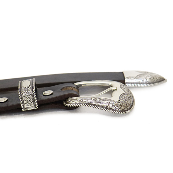 バックル、ベルトループ、剣先に装飾金具を取り付けた雰囲気ある1本。
